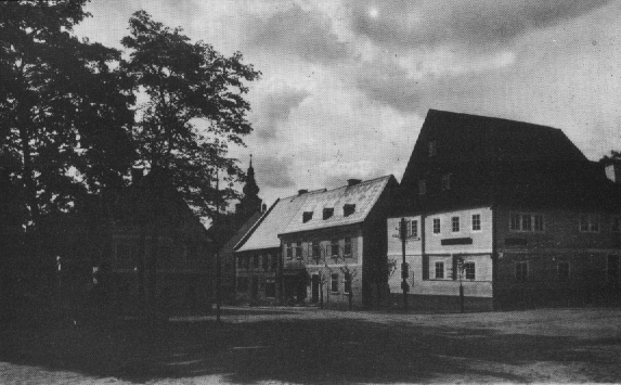 H01> Pfarrhof links - Schule und Kirche - Erzgebirge im Hintergrund